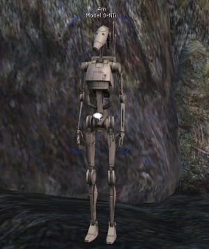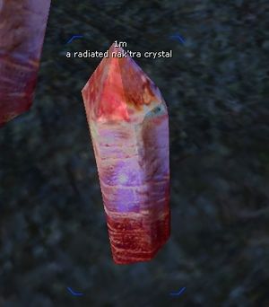 Wenn du den Weg hinter Erriya weitergehst, stoßt du letztlich an ein vergittertes Tor vor dem ein Droide Model 3-NIi /waypoint -473 61 steht. Dieser beauftragt dich einen Kristall zu suchen. Für diesen Radiated Nak'tra Crystal gehst du den Weg wieder zurück, bei Erriya vorbei bis du zu der kleinen Höhle kommst durch die ein Fluss fließt /waypoint -470 -234 . Hier findest du einige rote Kristalle. Klick einen davon an und dann gehts zurück zu Model 3-NIl der dich jetzt durch das Tor lässt.